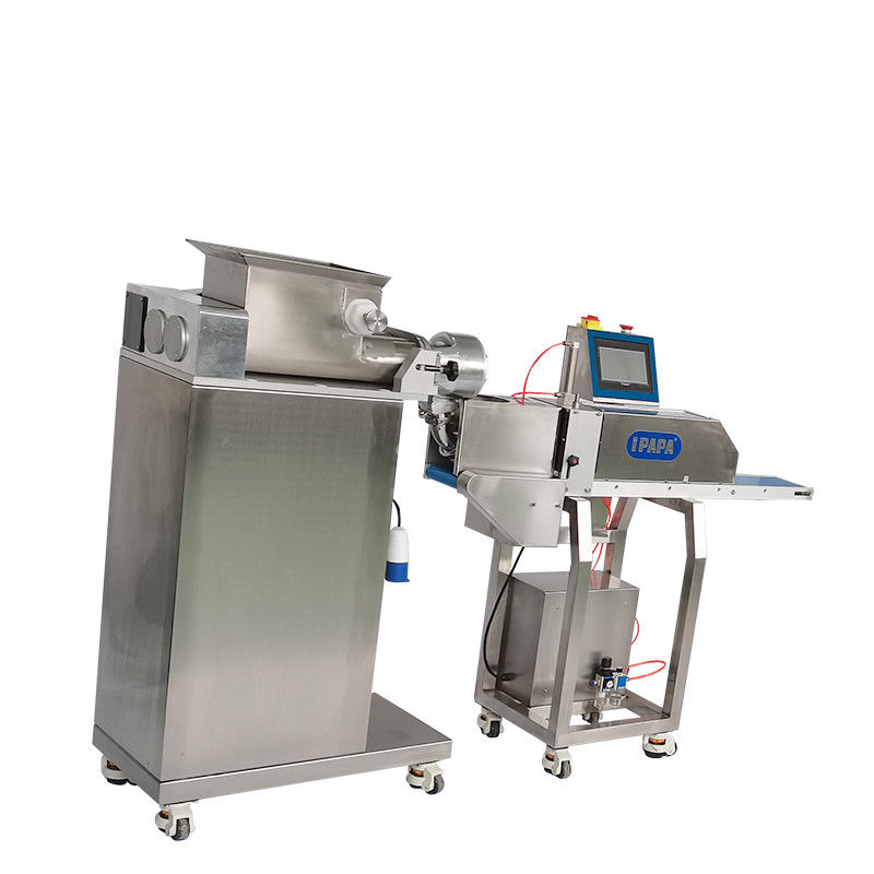 P160 Automatic encrusting machine is our multifunctional equipment to make center filled products, such as cookies, mooncakes, stuffed pies, filled balls, filled date bars, and so on. The encrusting machine can make round, ball, cone, bar, strip shapes, etc. So the encrusting machine can also make bar products, It can not make hard dough, but it is enough for normal products making.